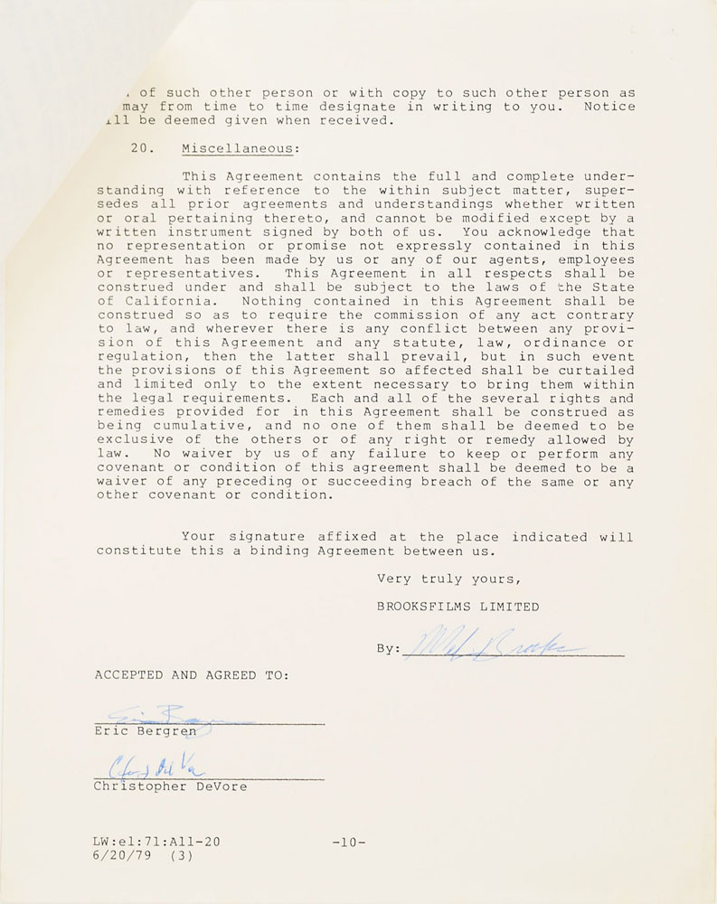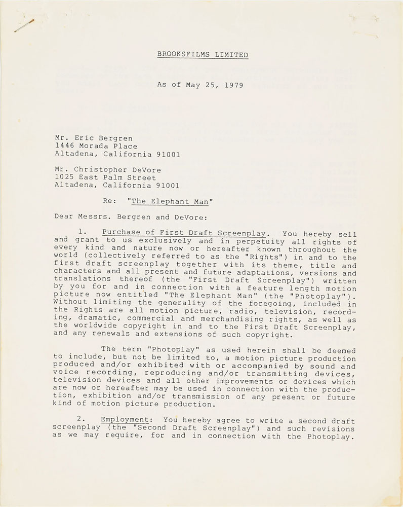 DS, ten pages, 8.5 x 11, May 25, 1979. Agreement between Eric Bergren and Christopher DeVore with Brooksfilms Limited, in which the former party "hereby sell and grant…all rights of every kind and nature…in and to the first draft screenplay together with its theme, title and characters and all present future adaptations, versions and translations thereof…in connection with a feature length motion picture now entitled 'The Elephant Man.'" Signed at the conclusion in blue ballpoint by Brooks, and countersigned by Bergren and DeVore, who, alongside David Lynch, earned Oscar nominations for Best Adapted Screenplay, one of eight nominations the film received for the 53rd Academy Awards. In fine condition.