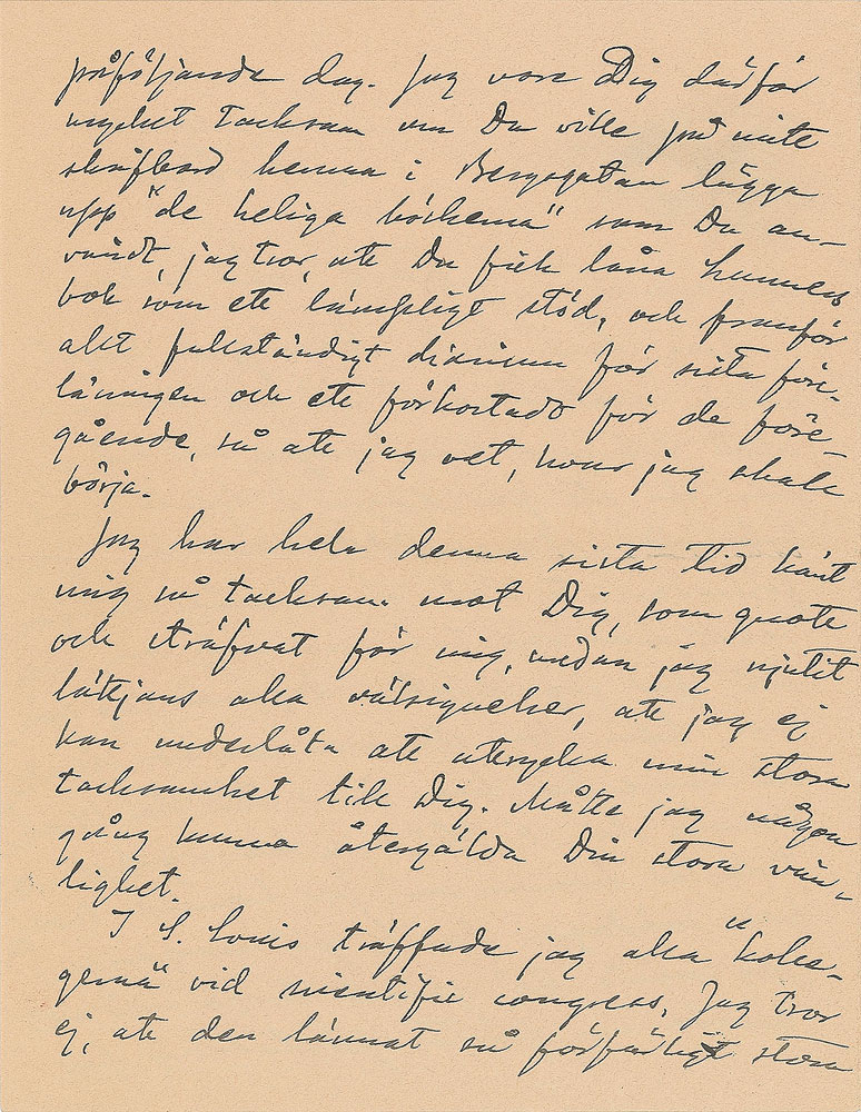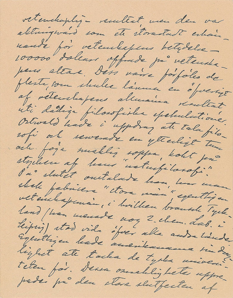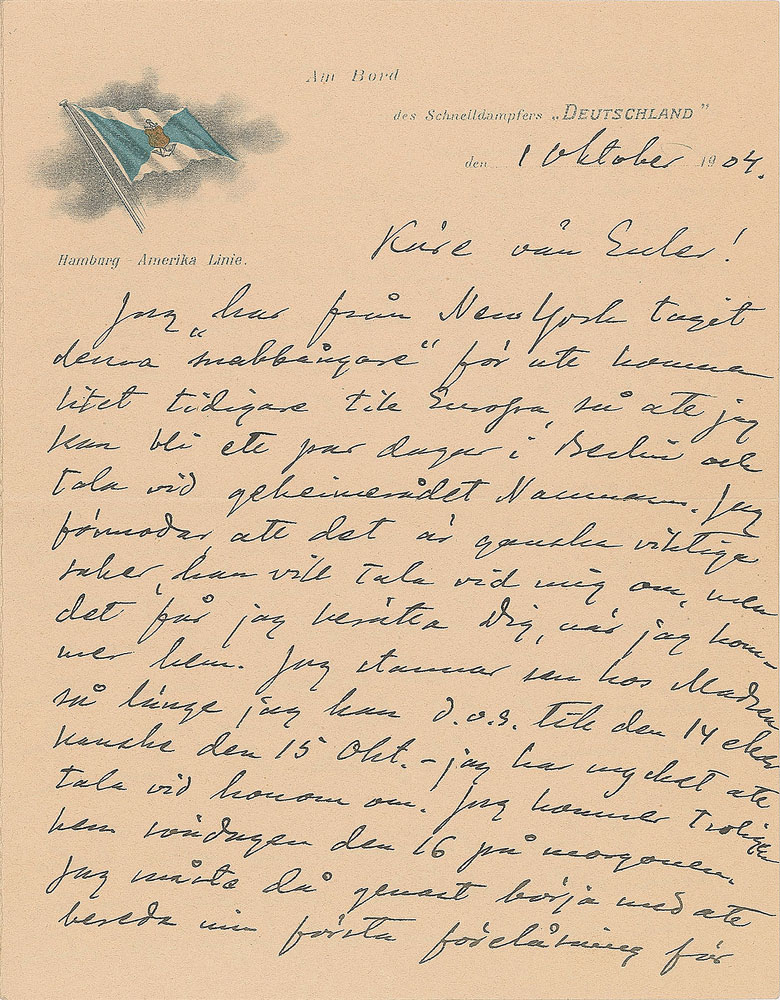 Influential Swedish scientist (1859-1927) who received the Nobel Prize for Chemistry in 1903 in recognition of his theory of electrolytic dissociation. ALS in Swedish, four pages on two adjoining sheets, 5.5 x 7.25, Hamburg-America Line letterhead, October 1, 1904. Letter to his assistant Hans von Euler-Chelpin, who would go on to win the 1929 Nobel Prize in Chemistry. Arrhenius describes his experience at the International Congress of Arts and Science in St. Louis, and details his scientific plans as soon as he will return to Europe. In fine condition.