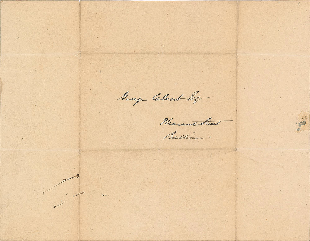 ALS, one page, 7.75 x 9.75, April 13, 1833. Letter to George Calvert in Baltimore, in part: "This will introduce you to my nephew Mr. Edgar Irving for whom I would bespeak the kind attention of yourself and Mrs. Calvert during his sojourn in Baltimore." Addressed on the reverse of the second integral page in Irving's hand. In fine condition, with some light stains, and moderate intersecting folds.