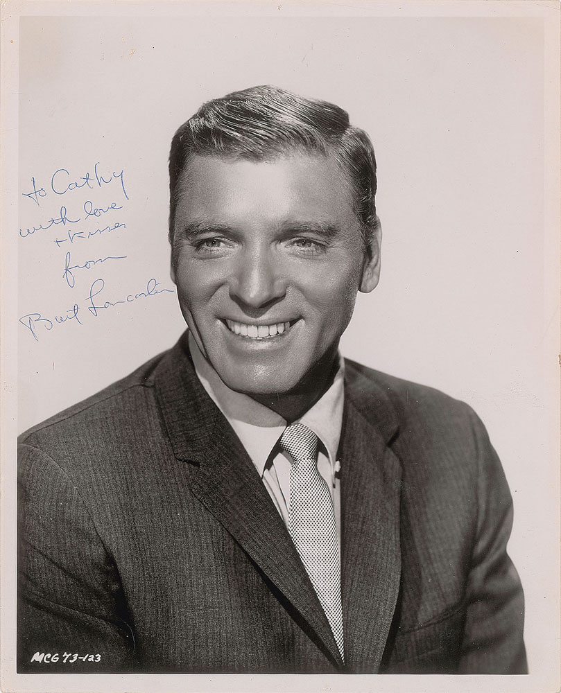 Glossy 8 x 10 publicity photo of Lancaster in a handsome suit and tie, signed and inscribed in blue ballpoint, "To Cathy, with love & kisses from Burt Lancaster.” In fine condition, with scattered light creasing and a small pin hole to the top border. Consignor notes that this originates from the collection of Cathy Crawford, the daughter of Joan Crawford.