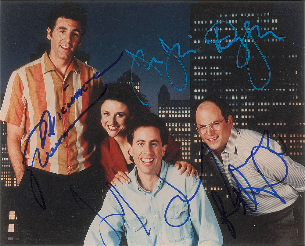 Glossy 10 x 8 photo of the Seinfeld cast posing against a city backdrop, signed in blue felt tip by Jerry Seinfeld, Jason Alexander, and Michael Richards, and in blue paint pen by Julia Louis-Dreyfus. In fine condition.