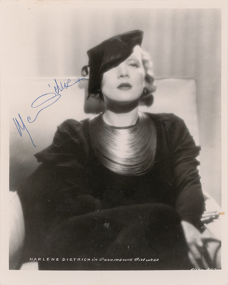 Glossy 8 x 10 Paramount Pictures photo of Dietrich, signed in black felt tip. In very good to fine condition, with light diagonal creases across the image.