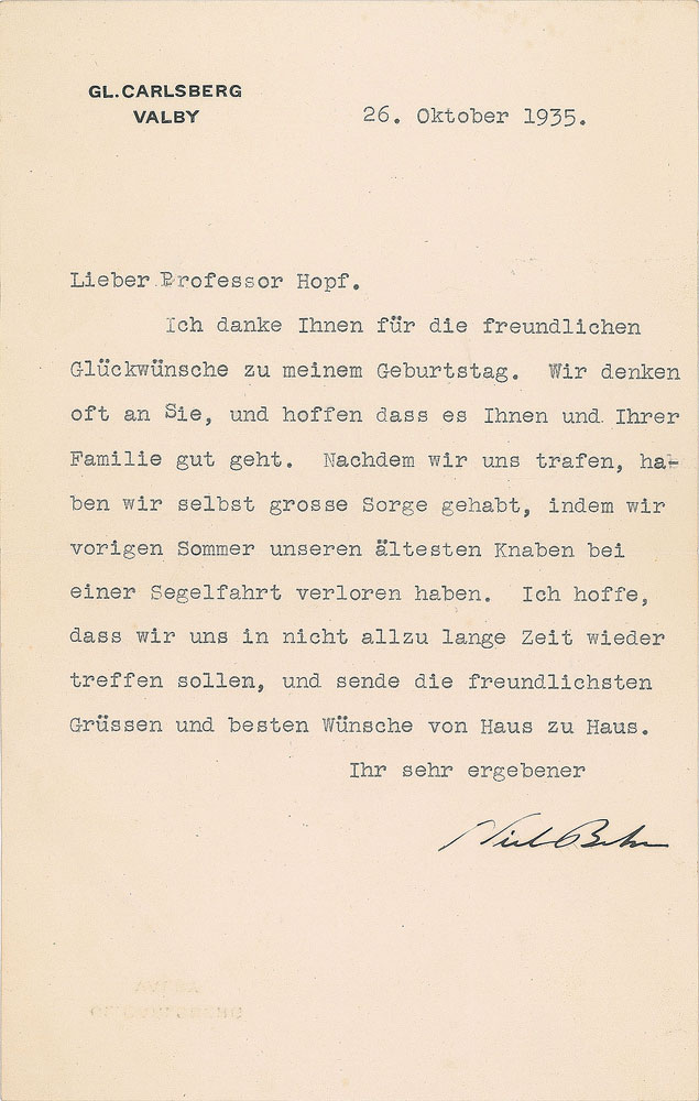 TLS in German, one page, 5.25 x 8.25, Carlsberg letterhead, October 26, 1935. Letter to Professor Hopf, in full (translated): "I thank you for the friendly congratulations on my birthday. We often think about them and hope that you and your family are well. After we met, we ourselves were very worried when we lost our oldest boy on a sailing trip last summer. I hope that we will meet again in not too long time, and send the kindest greetings and best wishes from door to door." In fine condition, with some light creasing to the lower blank area.