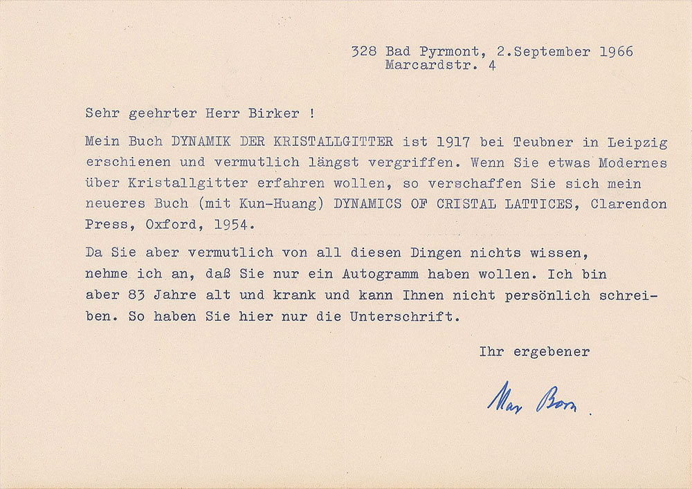 TLS in German,, one page, 8.25 x 5.75, September 2, 1966. Letter to Mr. Birker, in part (translated): "My book Dynamics of Crystal Lattices appeared in 1917 by Teubner in Leipzig and has probably long gone out of print. If you want to learn something modern about crystal lattices, get my newer book (with Kun-Huang) Dynamics of Cristal Lattices, Clarendon Press, Oxford, 1954. But since you probably do not know anything about all these things, I assume that you only want to have an autograph. But I'm 83 years old and sick and can not write to you personally. So you only have the signature here." In fine condition.