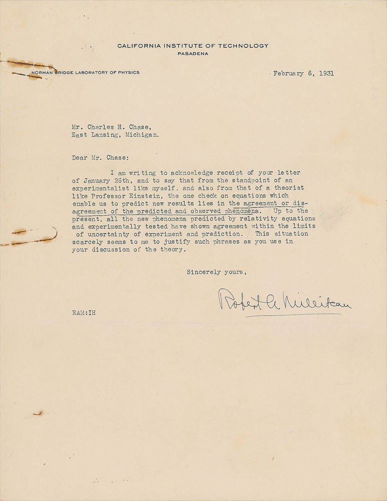 TLS, one page, 8.5 x 11, California Institute of Technology letterhead, February 6, 1931. Letter to Charles H. Chase, in full: "I am writing to acknowledge receipt of your letter of January 26th, and to say that from the standpoint of an experimentalist like myself, and also from that of a theorist like Professor Einstein, the one check on equations which enable us to predict new results lies in the agreement or disagreement of the predicted and observed phenomena. Up to the present, all the new phenomena predicted by relativity equations and experimentally tested have shown agreement within the limits of uncertainty of experiment and prediction. This situation scarcely seems to me to justify such phrases as you use in your discussion of the theory." In very good to fine condition, with a crease to the upper left, and rusty paperclip impressions to the left edge.