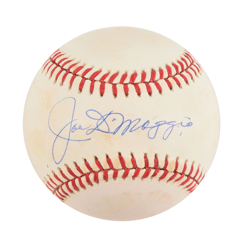 Official Rawlings American League (Brown) baseball signed on the sweet spot in blue ballpoint by Joe DiMaggio. In fine condition, with a hint of light staining.