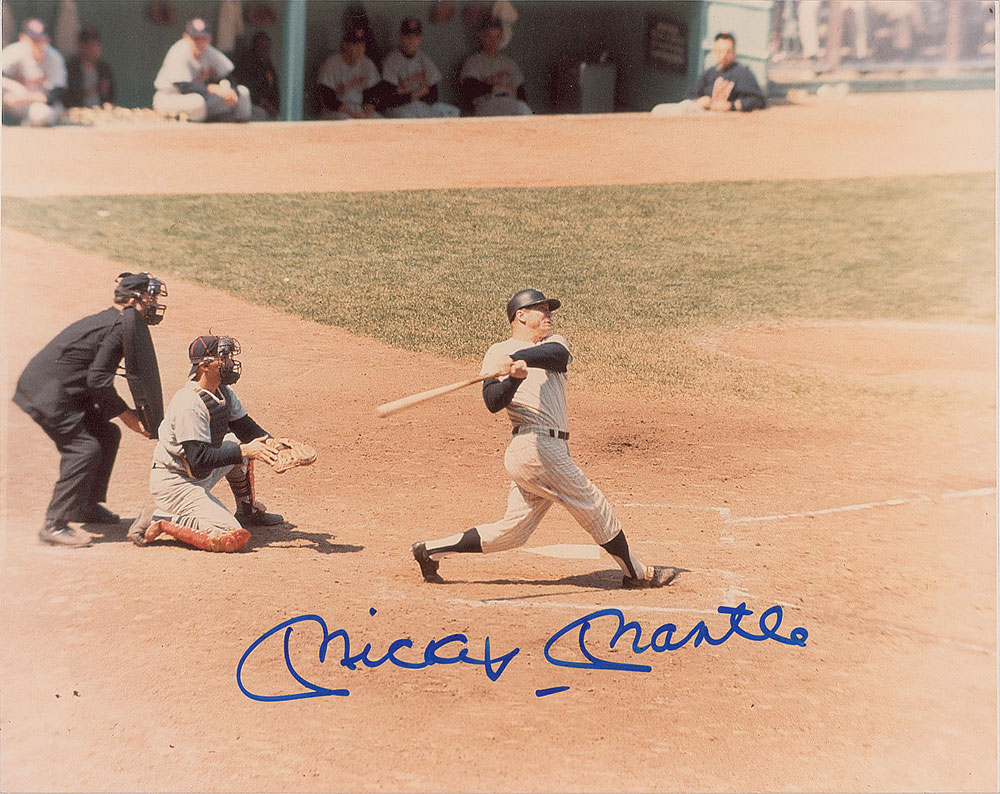 Color semi-glossy 10 x 8 photo of Mantle at the plate during a ball game, showing him in a powerful post-swing pose with his eyes looking to distant right field, signed in blue felt tip. In fine condition.