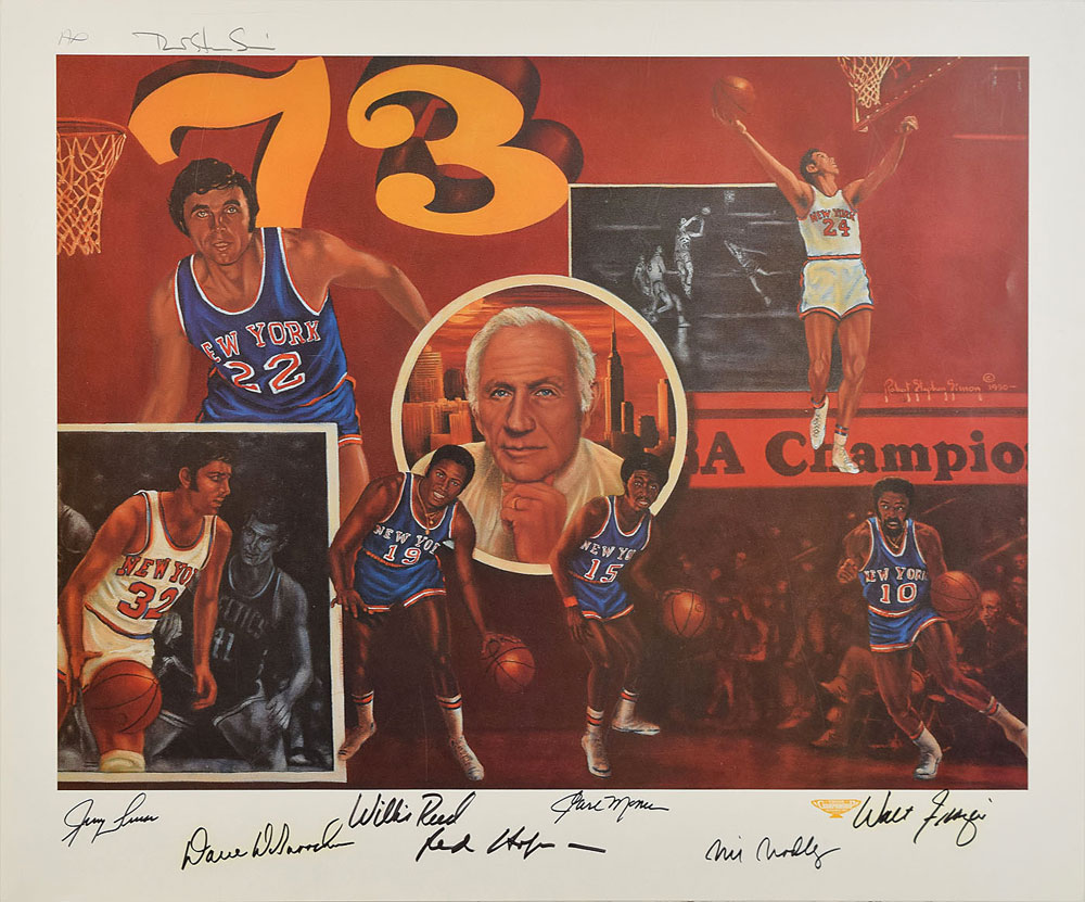 Color 29.25 x 24.25 artist's proof print honoring the 1973 New York Knicks championship team, signed in the lower border in black felt tip by Jerry Lucas, Dave DeBusschere, Willis Reed, Earl Monroe, Bill Bradley, Walt Frazier, and Red Holzman. Also signed in the upper border in pencil by the artist, "AP Robert Stephen Simon." Rolled and in fine condition, with a bit of haloing to the Frazier and DeBusschere signatures.
