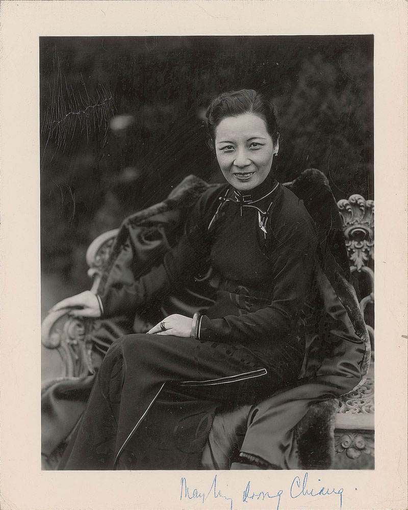 Striking pearl-finish 8 x 10 photo of Madame Chiang seated, signed in the lower border in blue ink, "Mayling Soong Chiang." Affixed to a same-size mount and in very good condition, with light overall creasing and crazing to the image.