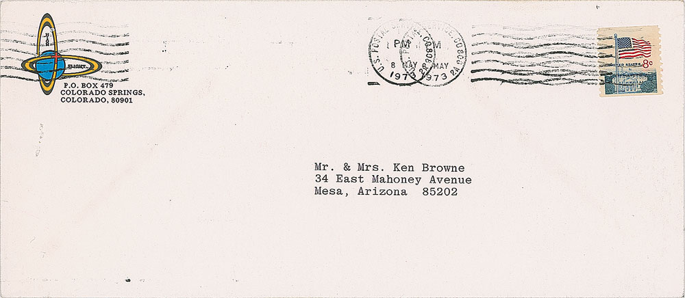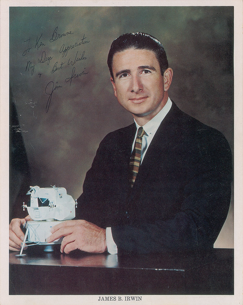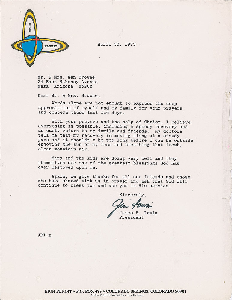 Group of three items signed by Irwin: an official color 8 x 10 NASA lithograph of Irwin posing with a model of the Lunar Module, signed and inscribed in black ballpoint, "To Ken Browne, My Deep Appreciation & Best Wishes, Jim Irwin"; a TLS, one page, 8.5 x 11, High Flight letterhead, April 30, 1973, in part: "With your prayers and the help of Christ, I believe everything is possible, including a speedy recovery and an early return to my family and friends"; and a High Flight business card, signed in black felt tip. In overall very good to fine condition, with light scuffing to the photo, and staple holes and creasing to the letter. Accompanied by the original mailing envelope, an unsigned candid photo of Irwin at a book signing in 1974, and a letter bearing a facsimile signature.