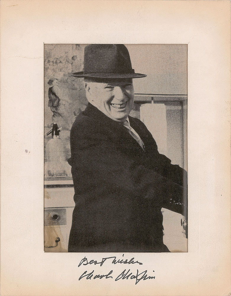 Desirable 4.5 x 6.5 magazine photo of Chaplin in Switzerland, presented in a 7.25 x 9.25 mat, signed on the mat in black felt tip, "Best wishes, Charlie Chaplin." Reverse bears a typed label indicating that it was signed in 1967. In very good to fine condition, with light toning, and a crease to the left side of the mat.