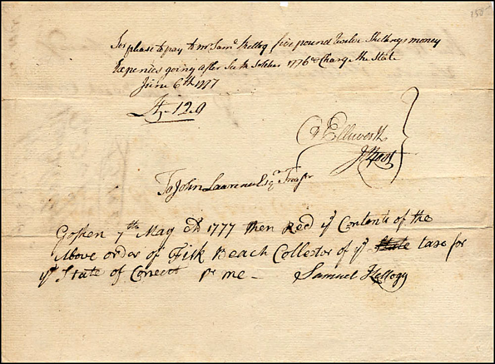 Third chief justice of the United States (1745-1807) and delegate to the Constitutional Congress who later submitted the amendments which became the Bill of Rights. Revolutionary War-dated manuscript DS, signed “O. Ellsworth,” one page, 8.5 x 6.25, June 6, 1777. Pay order issued to Treasurer John Lawrence, in part: "Pay to Mr. Sam'l Kellog five pound twelve Shillings money." Signed at the conclusion by Ellsworth, and endorsed below by Kellogg. In fine condition.
