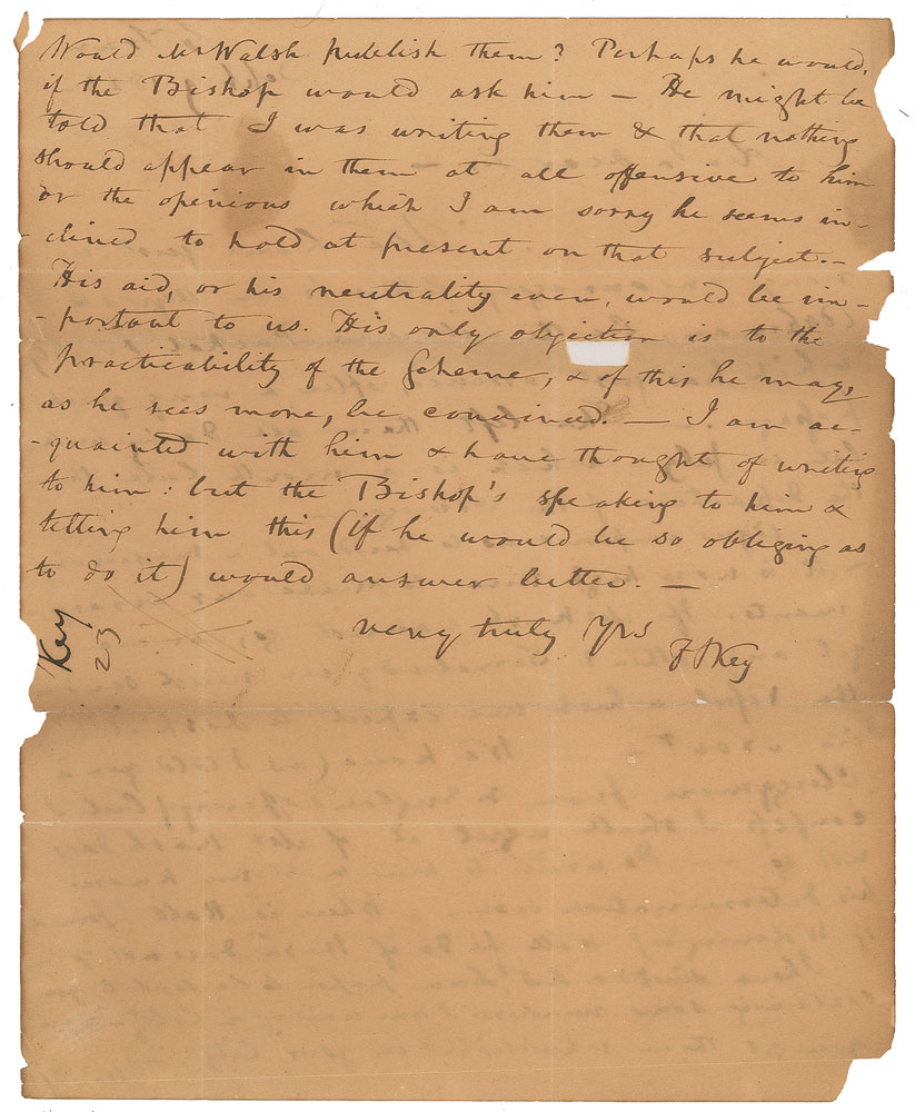 ALS signed “F. S. Key,” one page both sides, 7.75 x 9.75, September 9, 1823. Letter to "Rev'd & dear Sir" on the subject of colonization, the migration of free African-Americans to the continent of Africa. In full: "We have just rec'd very encouraging letters from Ayres & Ashman, by the Liberian packet Fidelity which has just arrived, after a very quick passage. She left them all doing well late in July—which is a month later than the departure of the Oswego. Ayres implores us to send out a missionary & it is now high time to make our arrangements. If Mr. Nash cannot go, can we get any other? Somebody we must send in the Vessel which we expect to despatch in Nov'r. We have (as I told you a clergyman from N. England offering) but I confess I shall regret it if Mr. Nash does not go. Do write to him & let me know his determination soon. Where is Hall (formerly of Wilmington) will he do if Nash does not go? I have directed a…paper to be sent to you containing some numbers I am writing on Colonz. Can you get them republished in your city? Would Mr. Walsh publish them? Perhaps he would, if the Bishop would ask him—He might be told that I was writing them & that nothing should appear in them at all offensive to him or the opinions which I am sorry he seems inclined to hold at present on that subject. His aid, or his neutrality even, would be important to us. His only objection is to the practicability of Scheme, & of this he may, as he sees more, be convinced. I am acquainted with him & have thought of writing to him: but the Bishop's speaking to him & telling him this (if he would be so obliging as to do it) would answer better." In very good condition, with tears and fold separations, chipping to the edges, and a small rectangular area of paper loss which affects none of the text. Key was a founding member and active leader of the American Colonization Society, which helped to establish Liberia as a home for former slaves.