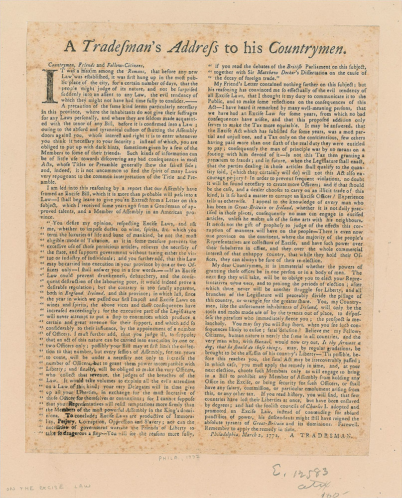Scarce pre-war broadside entitled "A Tradesman's Address to his Countrymen," one page, 7.75 x 9.75, signed in print, "A Tradesman, Philadelphia, March 2, 1772." An address speaking out against taxation and the "Excise Laws," concluding: "At your next election, choose such Members only as will engage to bring in a Bill to prohibit any Member of Assembly from holding any Office in the Excise, or being such security for such Officers…If you read history, you will find, that few countries have lost their liberties at once, but have been enslaved by degrees; and had the foolish councils of Charles I adopted and promoted an Excise Law, instead of contending for absurd punctilios of power, his descendants might still have reigned the absolute tyrants of Great-Britain and its dominions. Farewell. Remember to apply the remedy in time." Professionally inlaid into a slightly larger sheet and in fine condition, with scattered light foxing.