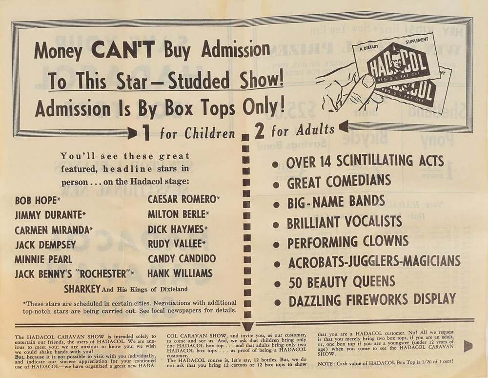 Extremely rare original handbill for the 1951 Hadacol Caravan Show, 5.5 x 8.5, with front reading: “Save your Hadacol Box Tops because Senator LeBlanc’s Sensational new Hadacol Caravan Show…is coming.” The Hadacol Caravan Show was a multi-artist traveling show promoting patent medicine Hadacol and featuring headline stars like Hank Williams, Bob Hope, Milton Berle, Jimmy Durante, Carmen Miranda, Jack Dempsey, Minnie Pearl, Rudy Valley, Caesar Romero, and others. In very good to fine condition, with wrinkling, light toning, and folds. Hadacol was a patent medicine marketed as a vitamin elixir that contained 12% alcohol, a quality that particularly appealed to dry areas of the South where alcohol wasn’t sold. In 1951, Hadacol owner Senator Dudley LeBlanc of Louisiana promoted Hadacol by sending the Hadacol Caravan Show around the country on a 17-car train called the Hadacol Special. The shows featured bicycle giveaways, beauty contests, and clowns selling the boozy vitamin supplement. In August-September 1951, Hank Williams played the final act of the show and brought people to their feet on a nightly basis.