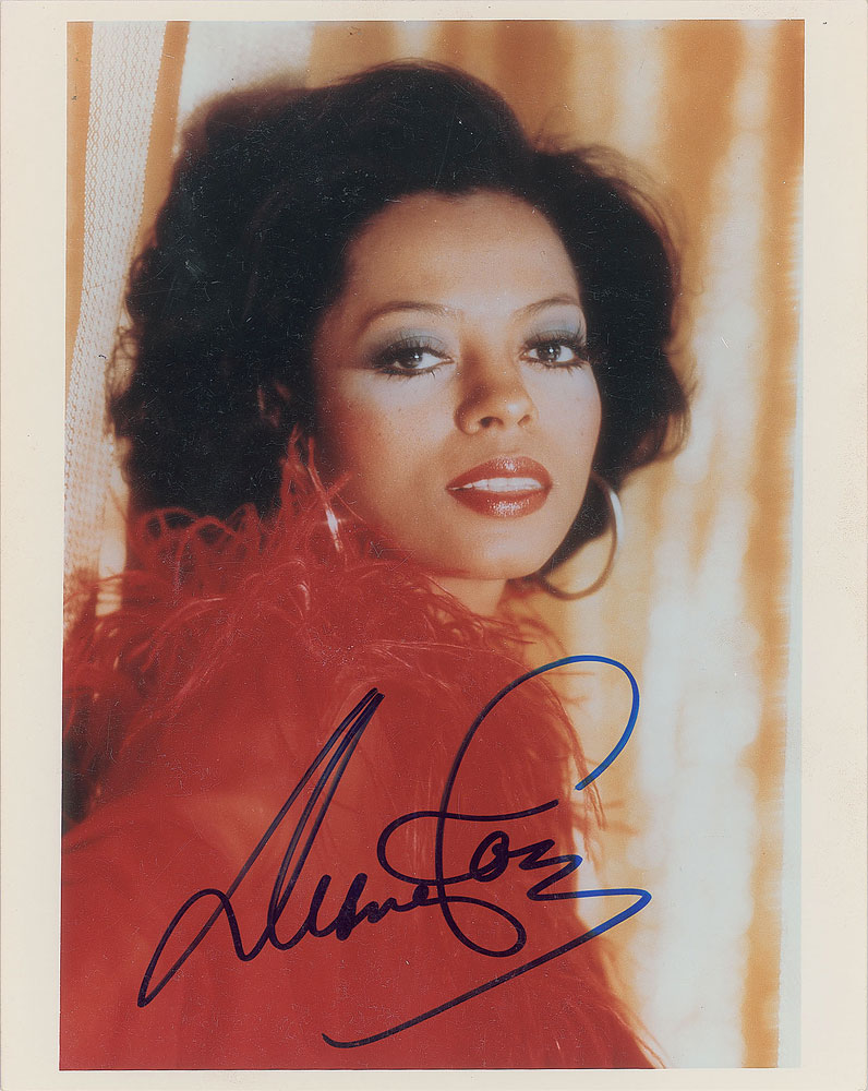 Color glossy 8 x 10 photo of Ross in a fabulous red outfit, signed in blue felt tip. In fine condition.