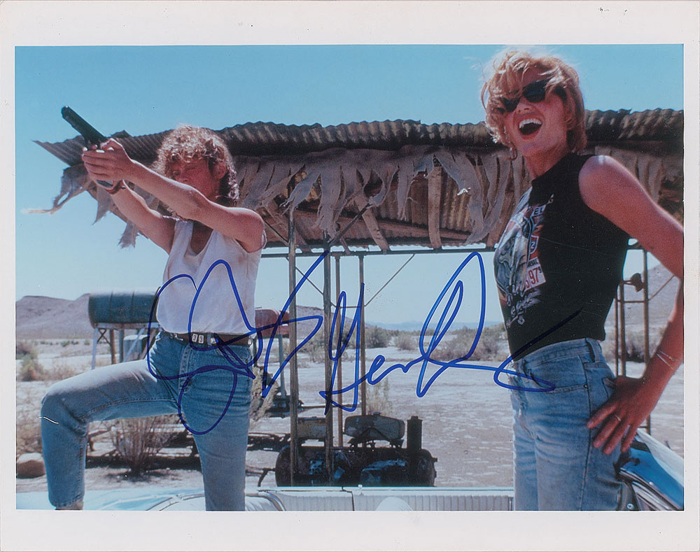 Color glossy 10 x 8 photo of Susan Sarandon and Geena Davis in their popular Thelma and Louise roles, signed in blue felt tip by both. In fine condition.