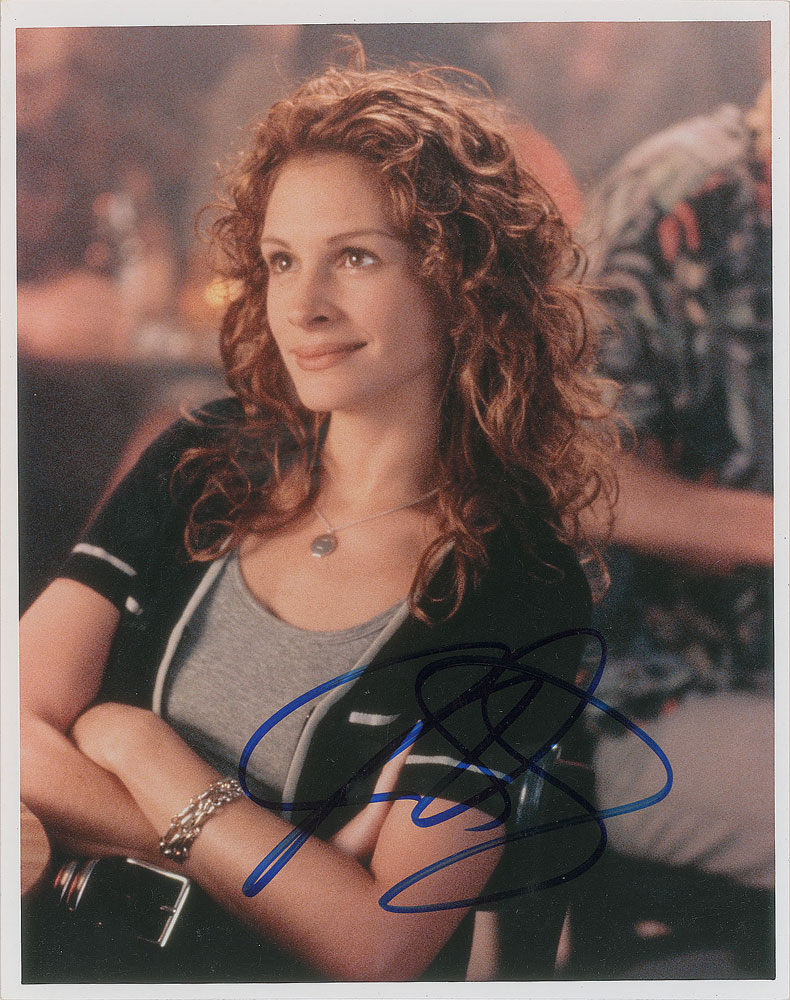 Color glossy 8 x 10 photo of Roberts with a sassy smile and her signature curly tresses, signed in blue felt tip. In fine condition, with a small crease to the right side.