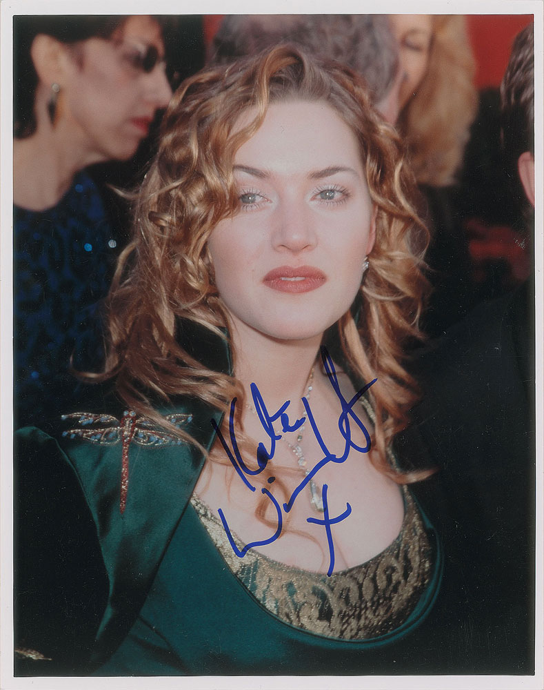 Color glossy 8 x 10 photo of Winslet circa her appearance in Titanic, signed in blue felt tip. In fine condition.