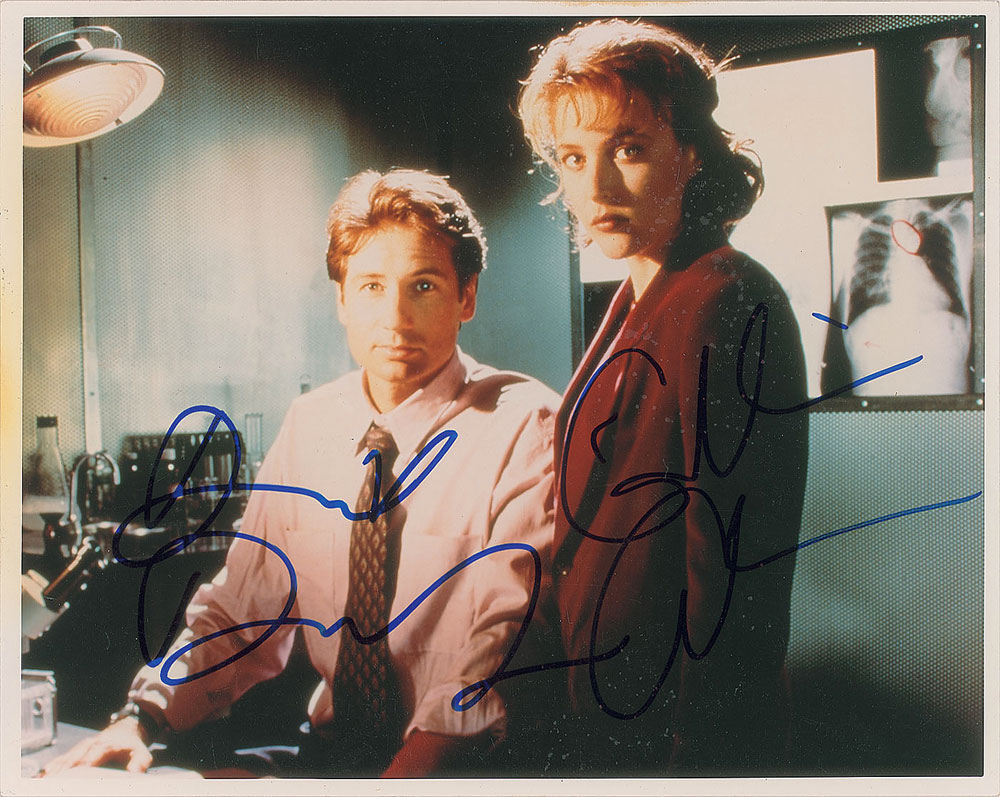 Color glossy 10 x 8 photo of X-Files FBI agents Mulder and Scully, signed in blue felt tip by David Duchovny and Gillian Anderson. In fine condition, with speckling to the emulsion over the right half of the photo.