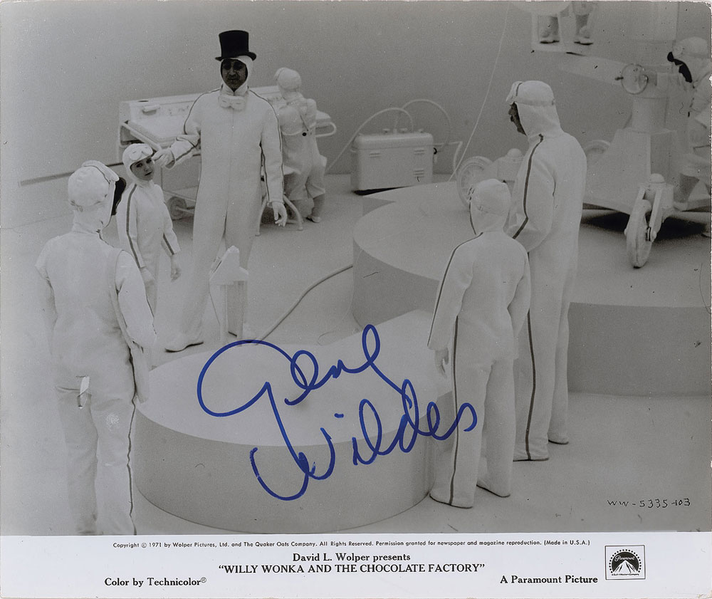 Glossy 9.5 x 8 Paramount Pictures production still from Willy Wonka and the Chocolate Factory, signed in blue felt tip by Gene Wilder. The photo is linen-backed and has a folded inch-wide three-hole-punched binder tab attached to the left edge. In fine condition.