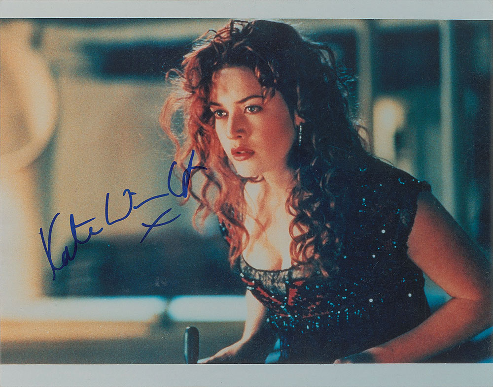 Color satin-finish 11 x 14 photo of Winslet in Titanic, signed in blue felt tip. In fine condition.