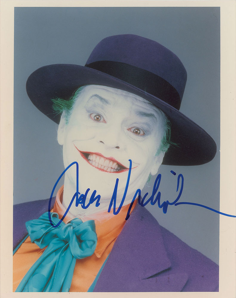 Fantastic color glossy 8 x 10 photo of Nicholson as The Joker from Tim Burton's 1989 superhero film Batman, signed in blue felt tip. In fine condition. Originally obtained by in-person specialist Mike Wehrmann.