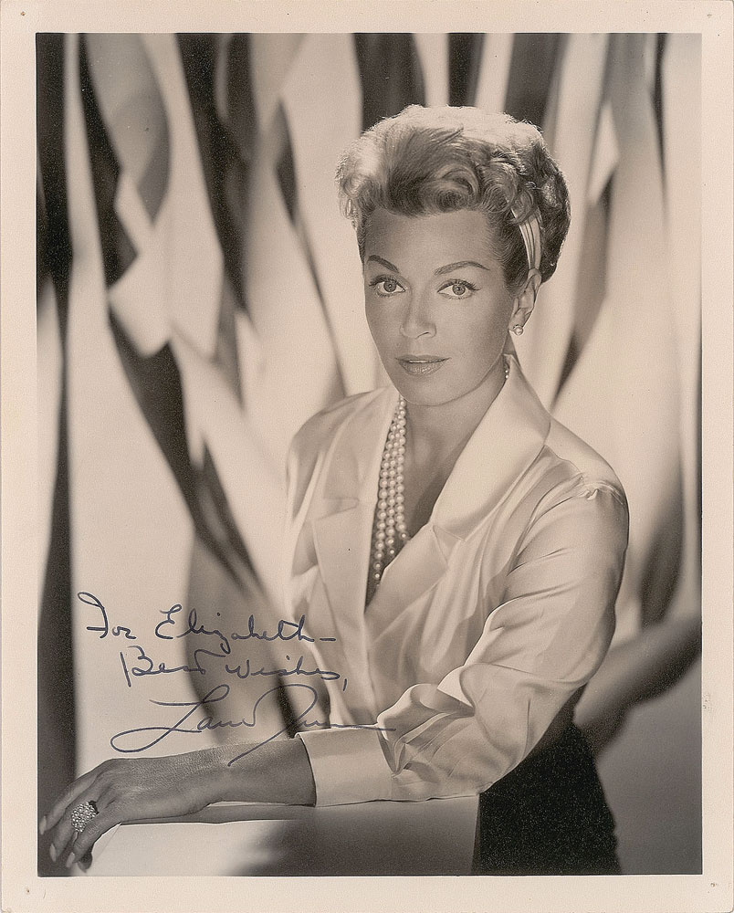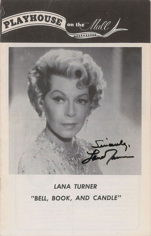 Two items: a vintage matte-finish 8 x 10 studio portrait of Turner in an elegant half-length pose, signed and inscribed in fountain pen, “For Elizabeth, Best wishes, Lana Turner"; and a Playhouse On The Mall program for performances of Bell, Book, and Candle at the Bergen Mall in Paramus, New Jersey, between July 19 and 24, 1977, twelve pages, 5.5 x 8.5, signed on the front cover in black felt tip, "Sincerely, Lana Turner." In overall fine condition, with a single tack hole to each corner tip of photo.