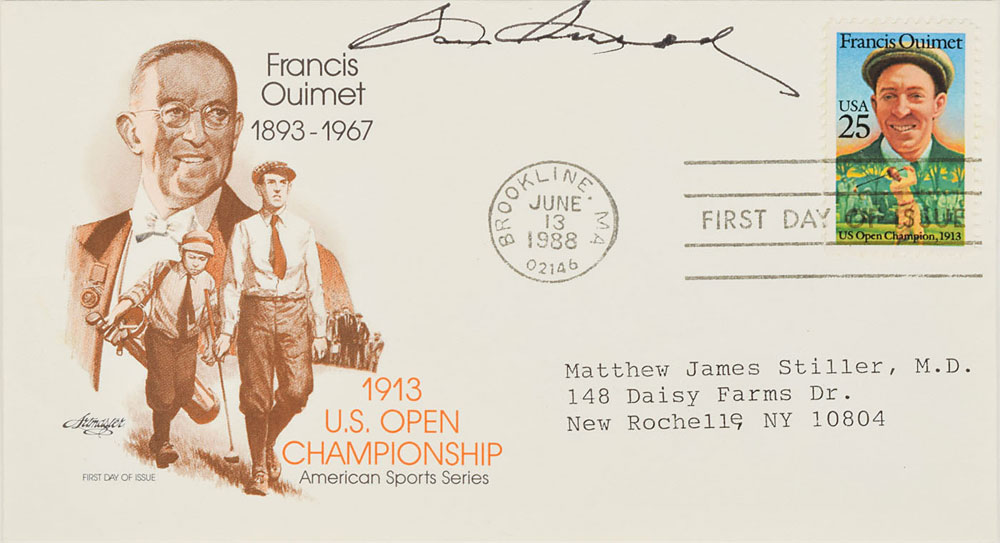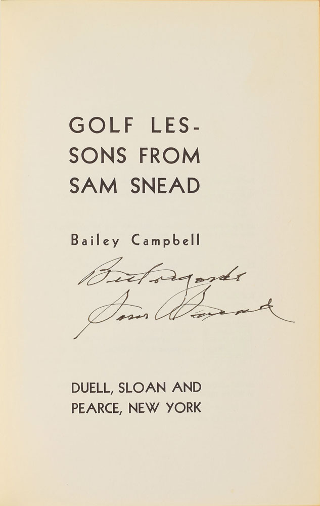 Three items: a first edition of Golf Lessons from Sam Snead, hardcover with dust jacket, signed on the title page in black ink, "Best regards, Sam Snead"; an FDC with a color cachet honoring US Open champion Francis Ouimet, signed in black ink, "Sam Snead"; and a color satin-finish 8 x 10 photo of an artistic portrayal of Snead swinging a golf club at his home course in White Sulphur Springs, signed and inscribed in thin black felt tip, "To Matt, Best regards, Sam Snead." In overall fine condition.