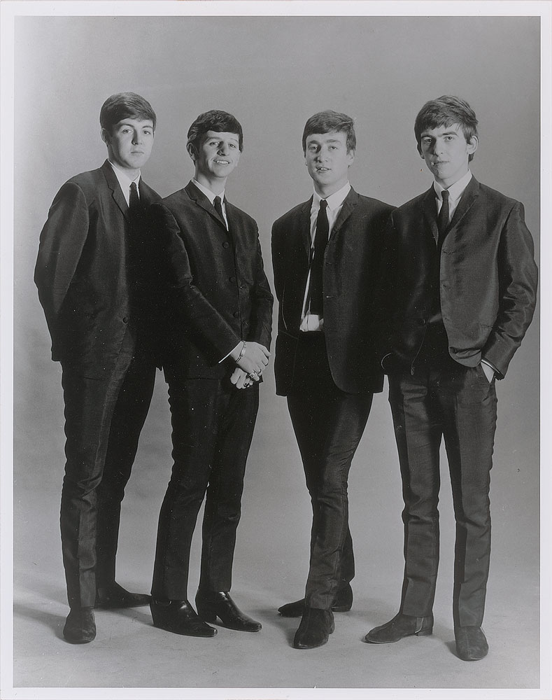Attractive satin-finish 11 x 14 photo of the Beatles in a full-length group pose wearing matching, modish suits; the image was originally taken by Astrid Kirchherr in November 1962. In fine condition.