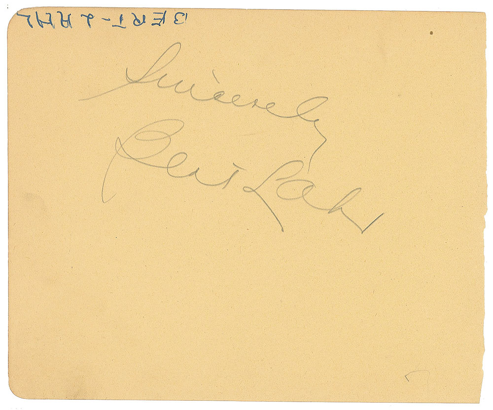 Vintage pencil signature, "Sincerely, Bert Lahr,” on a light yellow 6.25 x 5 album page. In fine condition. Accompanied by an unsigned photo of Lahr as the Cowardly Lion from The Wizard of Oz.