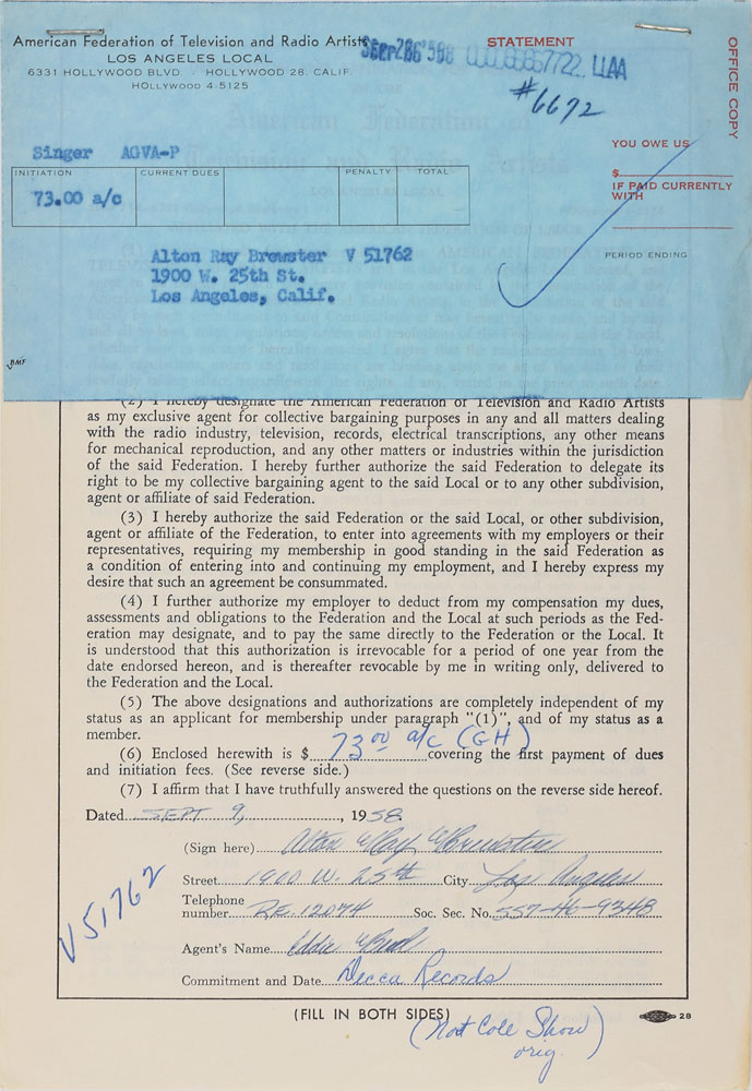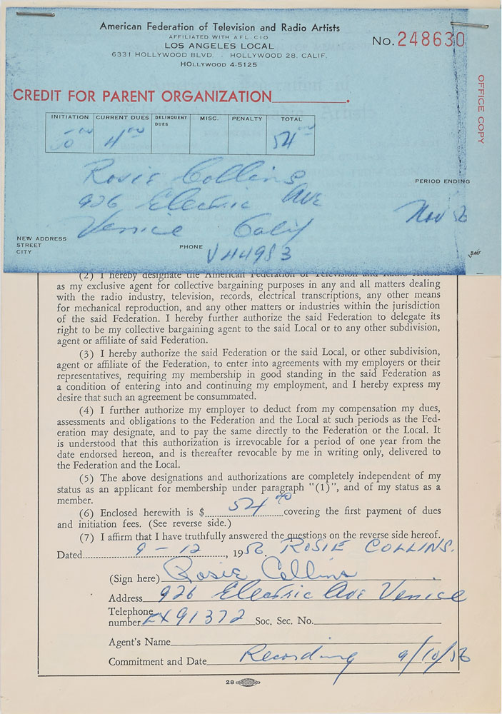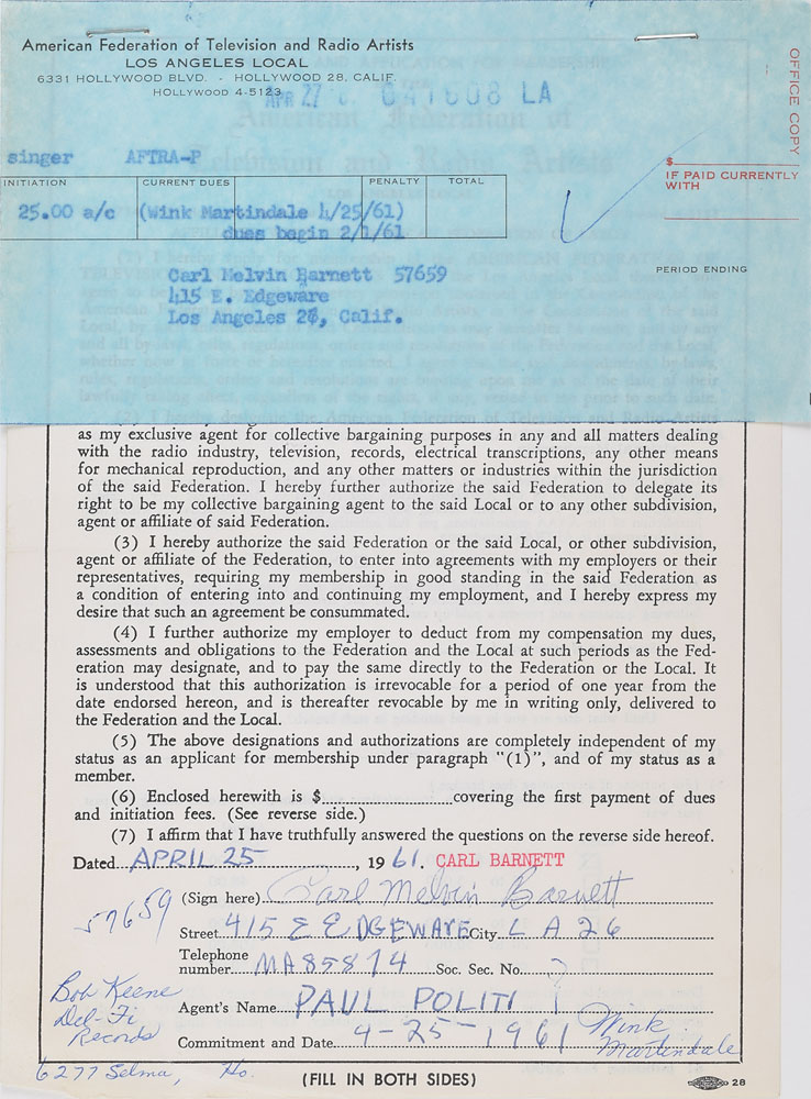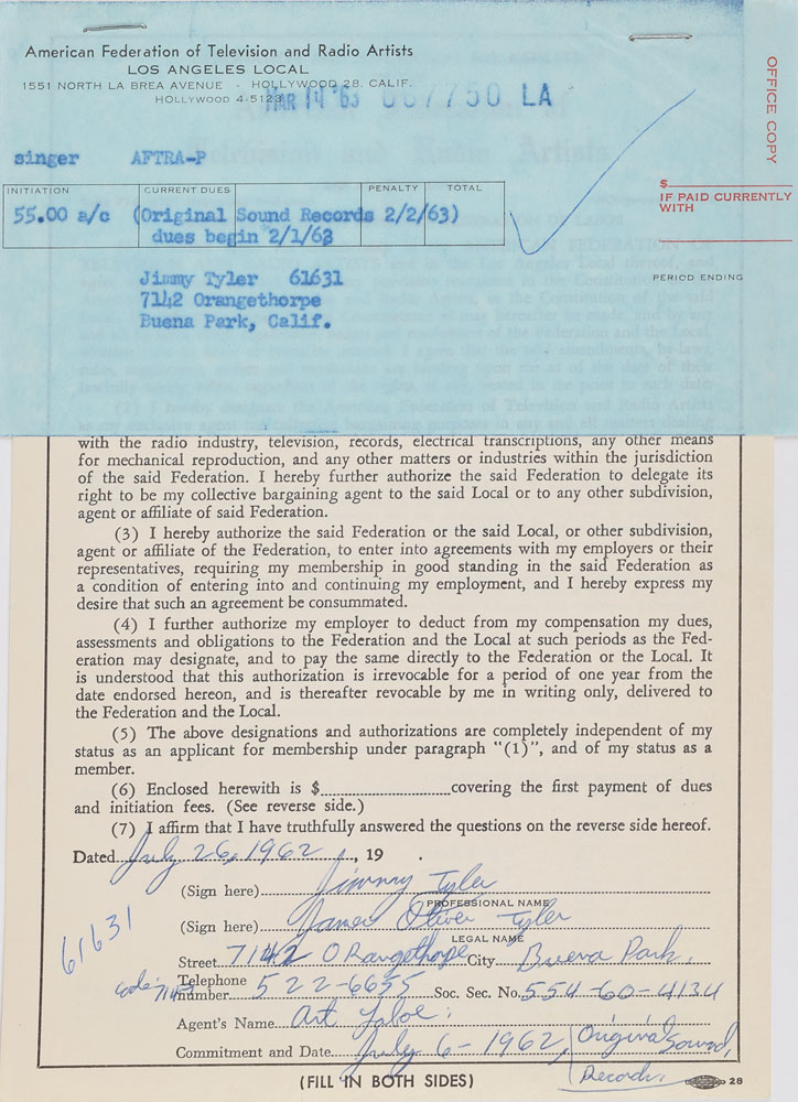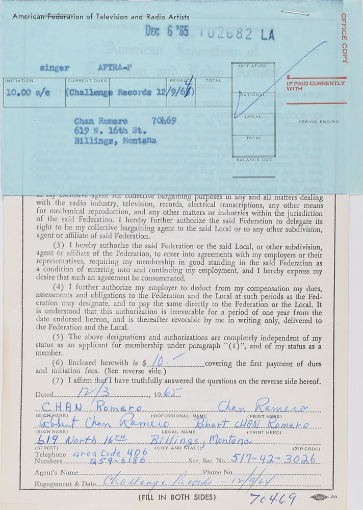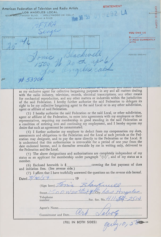 Collection of 19 AFTRA application memberships for doo-wop and rock artists from the late 1950s and early 1960s, including: Chan Romero; Betty and Rosie Collins of The Teen Queens; Carl Burnett, Leroy Sanders, David Johnson, and Early Harris of Little Caesar & the Romans; Jimmy Tyler, William Powers, Chuck Weldon, and Bill Meyers of The Paradons; Ray Brewster, Evelyn King, Curtis Williams, and Cleveland Duncan of The Penguins; and Toncie Blackwell, Frankie Ervin, Thomas Williams, and Horace Wooten of The Shields. In overall fine condition.