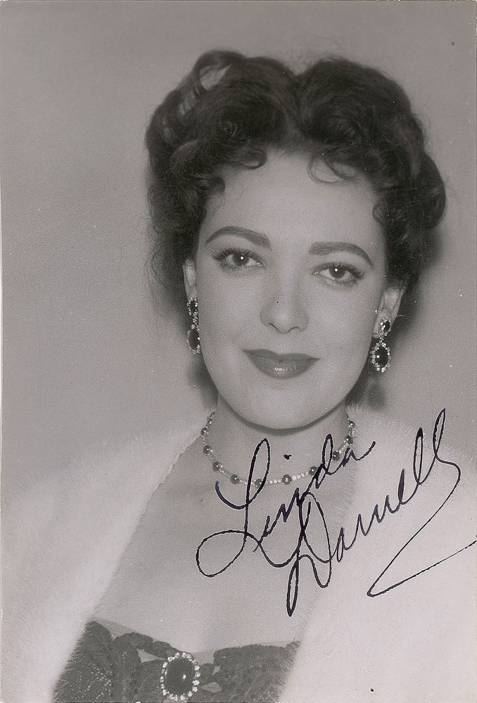 Vintage glossy 3.5 x 5 photo of Darnell in an attractive close-up pose with white fur coat and matching jewelry, signed in fountain pen. In fine condition, with a light crease passing across the bridge of her nose.