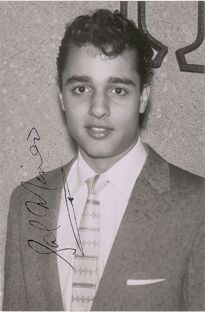 Vintage glossy 3.5 x 5 photo of Mineo wearing a suit and tie and looking directly into the camera, signed vertically in black ink. In fine condition.