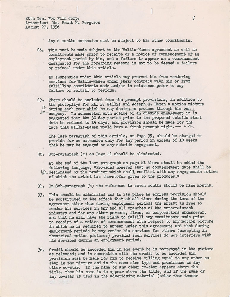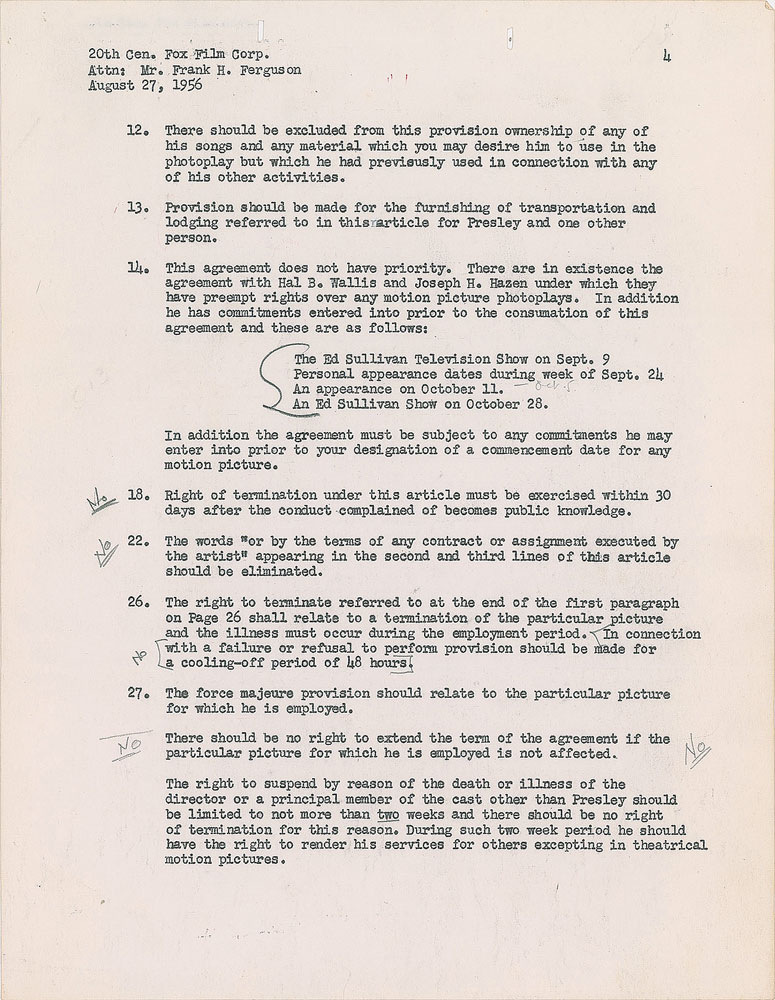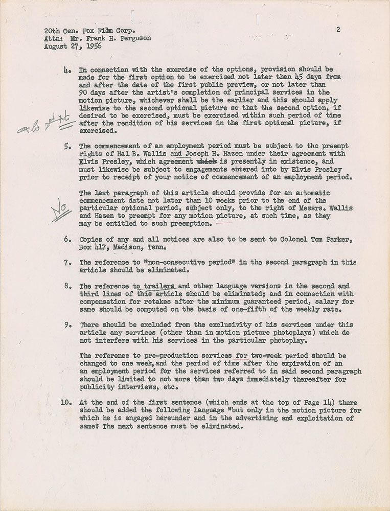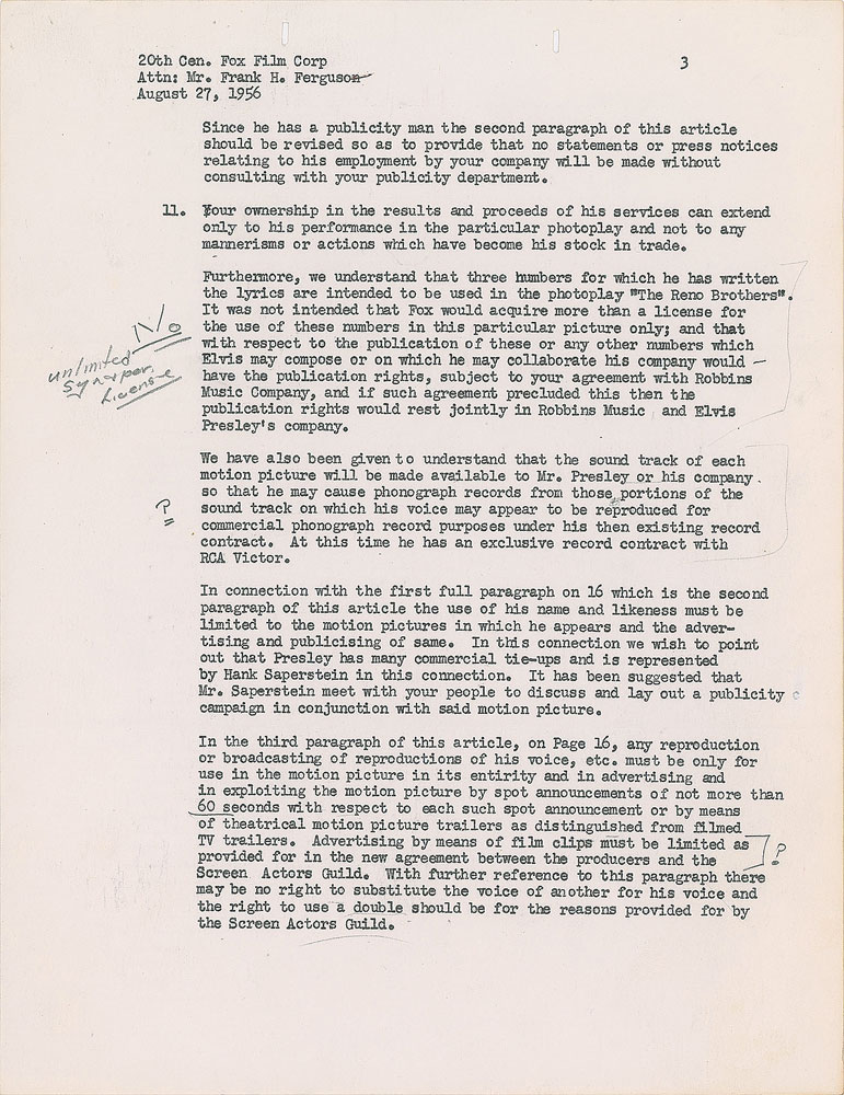 Unsigned document, six pages, 8.5 x 11, August 27, 1956. Official letter from the William Morris Agency, "as agents for Elvis Presley and together with Colonel Tom Parker," directed to Frank H. Ferguson and the 20th Century-Fox Film Corporation in regard to a total of 36 suggested changes to an earlier agreement dated August 14, 1956. Of particular note is section 11, which reads in part: "We understand that three numbers for which he has written the lyrics are intended to be used in the photoplay 'The Reno Brothers.' It was not intended that Fox would acquire more than a license for the use of these numbers in this particular picture only; and that with respect to the publication of these or any other numbers which Elvis may compose or on which he may collaborate his company would have the publication rights, subject to your agreement with Robbins Music Company, and if such agreement precluded this then the publication rights would rest jointly in Robbins Music and Elvis Presley's company." Signed at the conclusion by Presley's William Morris agent Ann Rosenthal. In fine condition. Elvis' acting debut came in the 1956 film Love Me Tender, which was originally titled The Reno Brothers; when advanced sales of Presley's 'Love Me Tender' single passed one million—a first for a single—the film's title was changed.