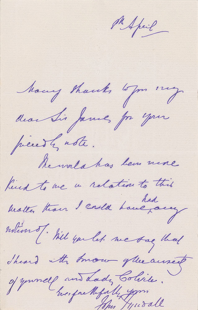 Prominent physicist (1820-1893) known for his study of diamagnetism and his realms of infrared radiation and the physical properties of air. ALS, one page, 4.5 x 7, blindstamped Royal Institution of Great Britain letterhead, April 9, [no year]. In part: "Many thanks…for your friendly note. The world has been more kind to me in relation to this matter than I could have had any notion of." In fine condition.