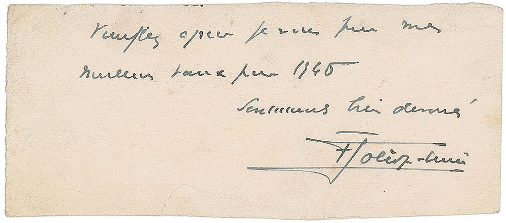 French physicist (1900-1958) and son-in-law to Pierre and Marie Curie, who was awarded the 1935 Nobel Prize in Chemistry. Fountain pen signature, "F. Joliot-Curie,” on an off-white 4.25 x 1.75 slip clipped from the conclusion of an autograph letter. In very good condition, with heavy overall creasing.