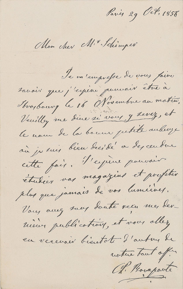 French biologist and ornithologist (1803-1857) who was the nephew of Napoleon Bonaparte. Rare untranslated ALS in French, signed “Ch. Bonaparte,” one page, 5.25 x 8, October 29, 1858. In fine condition.