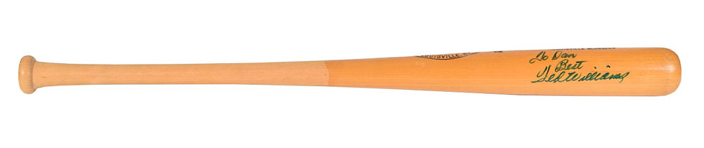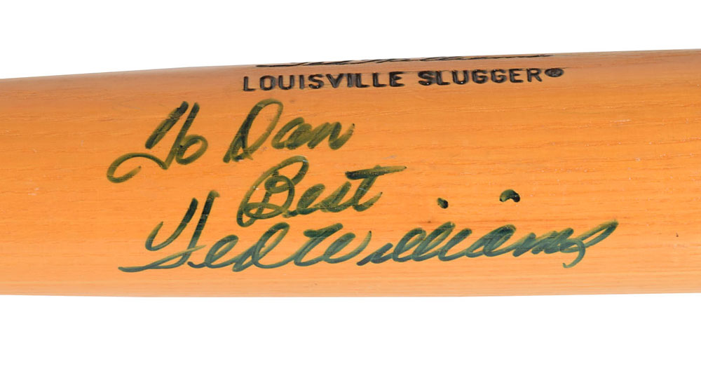 Official Louisville Slugger Ted Williams model baseball bat signed and inscribed on the barrel in black felt tip, "To Dan, Best, Ted Williams." In fine condition.