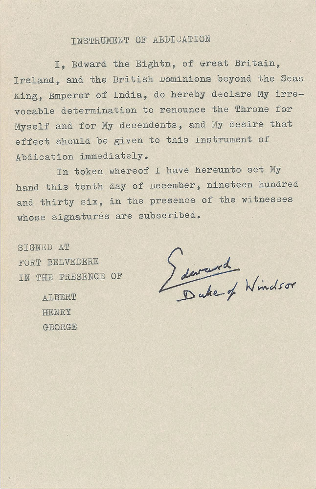 Souvenir typescript of King Edward VIII's "Instrument of Abdication," signed "Edward, Duke of Windsor," one page, 5.5 x 8.75, in part: "I, Edward the Eighth…do hereby declare My irrevocable determination to renounce the Throne for Myself and for My descendants, and My desire that effect should be given to this Instrument of Abdication immediately. In token whereof I have hereunto set My hand this tenth day of December, nineteen hundred and thirty-six." In fine condition, with trimmed edges. Edward's intention to marry the divorced American socialite Wallis Simpson caused a British constitutional crisis. Rather than give up his wife-to-be, he decided to abdicate. A historic piece from Edward VIII, who famously chose love over the British throne.