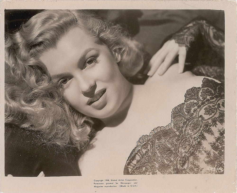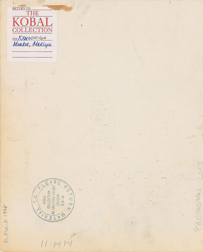 Fabulous original vintage glossy 9.75 x 8 silver gelatin publicity photo of the young Monroe, bearing an inherent caption, "Copyright 1948, United Artists Corporation. Permission granted for Newspaper and Magazine reproduction. (Made in U.S.A.)." Reverse is linen-backed and bears a "Kobal Collection" stamp and label. In fine condition, with scattered light creasing.