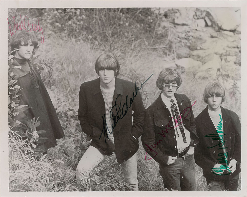 Vintage glossy 10 x 8 group photo of The Byrds posing outdoors, signed in red ink by David Crosby and Jim McGuinn, in black felt tip by Michael Clarke, and in green felt tip by Chris Hillman. In very good to fine condition, with a crease to the upper left corner passing through Crosby's signature.
