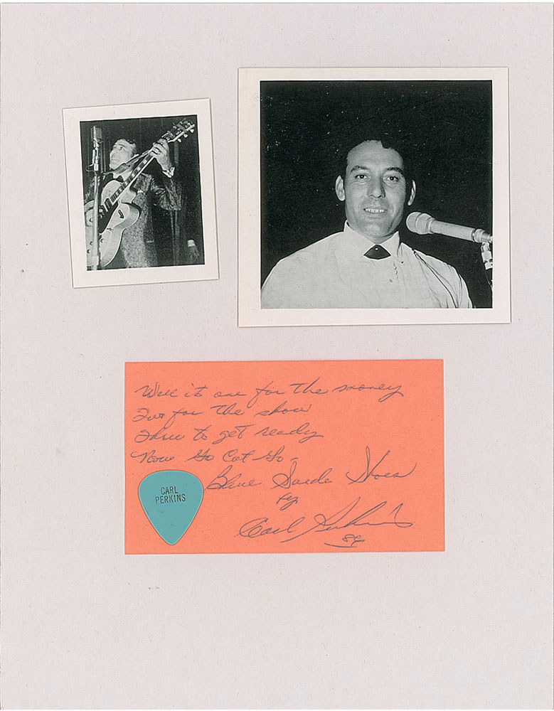 Exceptional autograph lyrics from the hit song 'Blue Suede Shoes,' on a peach 5 x 3 card, in full: "Well it's one for the money, Two for the show, Three to get ready, Now go cat go—Blue Suede Shoes, by Carl Perkins, 84." Affixed to the card is a blue "Carl Perkins" guitar pick. The card has been affixed to an 8.5 x 11 mount which also bears two cardstock images of the rockabilly legend. In fine condition.