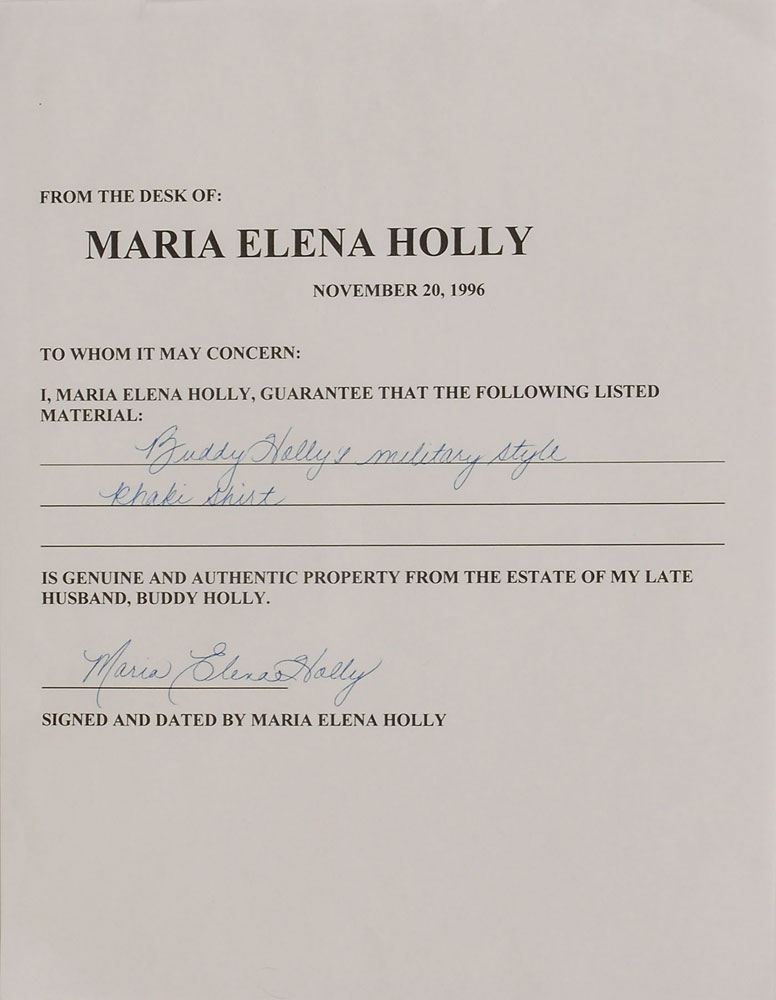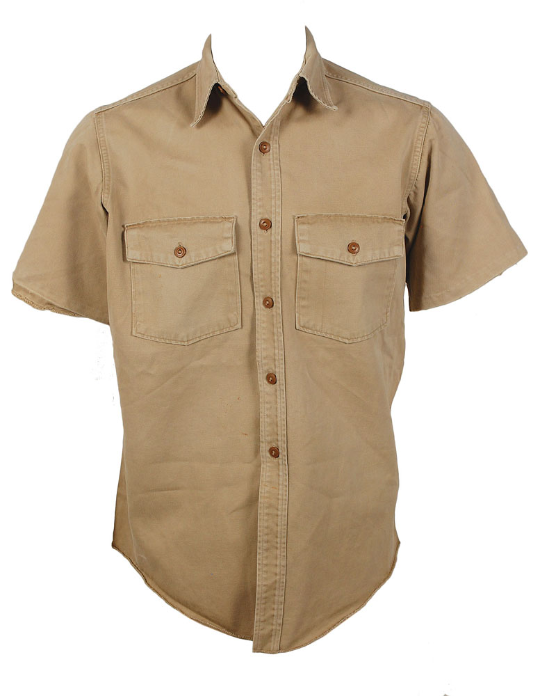 Buddy Holly's personally-owned and -worn beige Dickie's short-sleeve khaki work shirt, no size but likely large, used by Holly when he helped lay tile with the Holley Tile Company, the business owned by his older brother Larry. In very good to fine condition. Accompanied by a letter of provenance from Holly's wife, Maria Ellen Holly, dated November 20, 1996, in part: "I…guarantee that…Buddy Holly's military style khaki shirt is genuine and authentic property from the estate of my late husband."