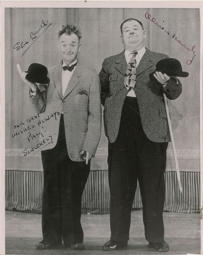 Vintage glossy 7.75 x 9.75 full-length photo of the famed comedy duo standing side-by-side, signed and inscribed in fountain pen, "Our best wishes always, Pam! Sincerely, Stan Laurel" and "Oliver Hardy.” In very good condition, with scattered light creasing, trimmed borders, and areas of light silvering.