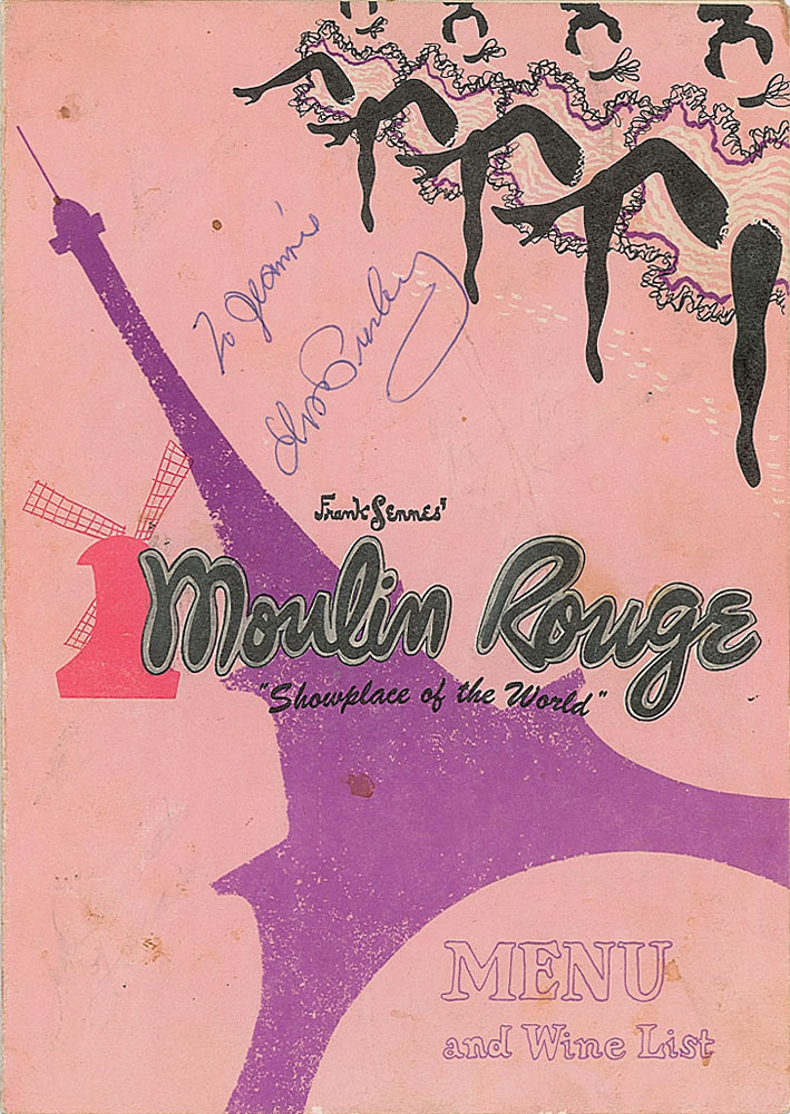 Vintage menu from Frank Sennes' Moulin Rouge in Hollywood, 6.75 x 9.5, signed and inscribed on the front cover in blue ballpoint, "To Jeannie, Elvis Presley." In very good to fine condition, with light staining and handling wear, and erasures to several other unidentified signatures. Accompanied by a full letter of authenticity from REAL. The doors of the Moulin Rouge opened on December 25, 1953, and quickly became a hub for Hollywood elite eager to take in its nightly performances by stars like Peggy Lee, Ella Fitzgerald, Dean Martin, Frankie Laine, and Liberace. However, by the late fifties, Sennes found it increasingly difficult to compete with the high salaries offered in Las Vegas, and he closed the Moulin Rouge in 1960.