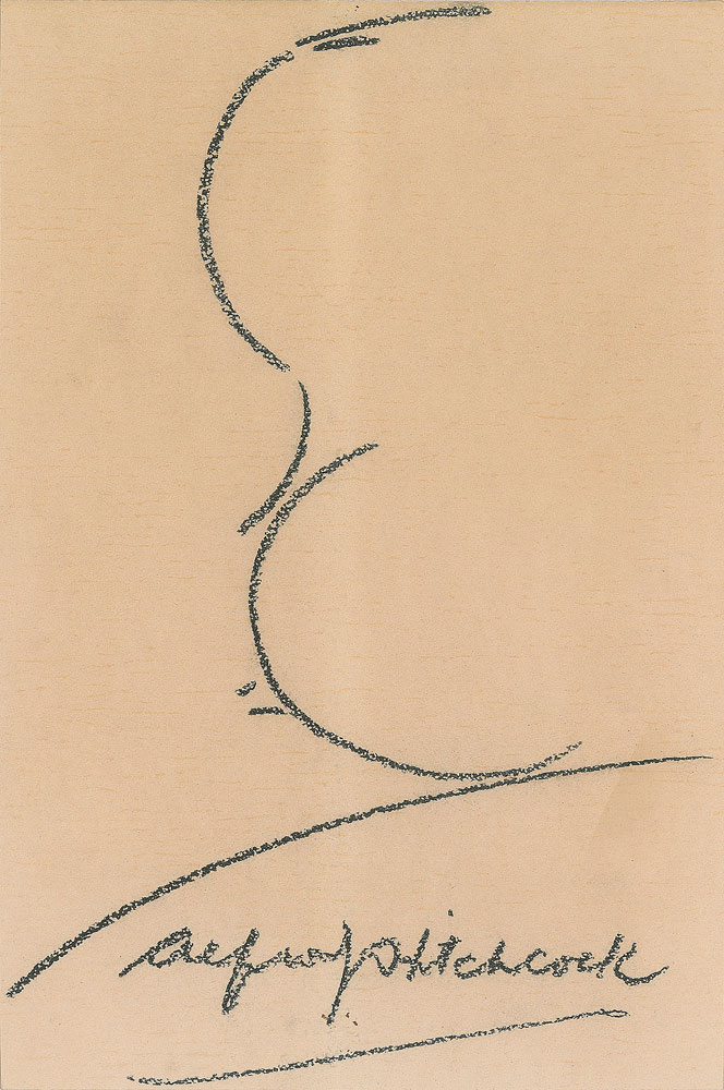 Original artist's pencil self-portrait sketch of his immediately recognizable profile on a beige 8 x 11.75 cardstock sheet, signed below, "Alfred J. Hitchcock." In fine condition, with some light toning.