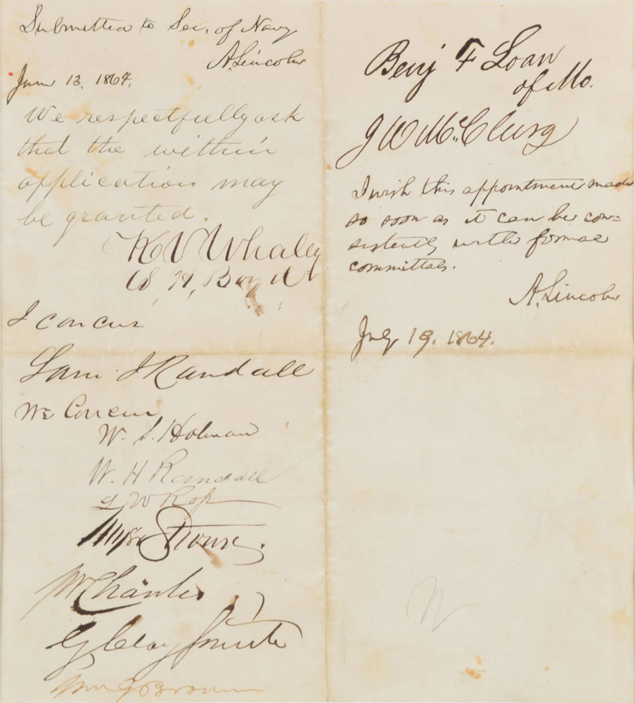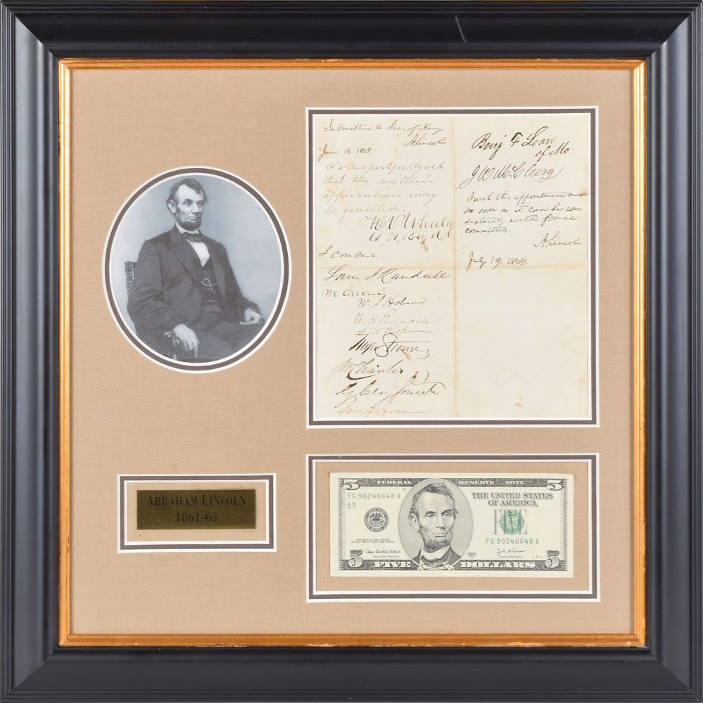 Remarkable pairing of autograph endorsements signed as president, one page, 7 x 7.5, both dated 1864. The first, in full: "Submitted to Sec. of Navy, A. Lincoln, June 13, 1864." This is followed by a series of endorsements from several congressmen: Kellian Whaley, Samuel J. Randall, William S. Holman, William H. Randall, Lewis W. Ross, Myer Strouse, John W. Chanler, Green Clay Smith, William G. Brown, Benjamin F. Loan, and Joseph W. McClurg. President Lincoln then pens a longer endorsement: "I wish this appointment made so soon as it can be consistently with formal committees. A. Lincoln, July 19, 1864." Attractively double-matted and framed with a portrait, plaque, and $5 bill to an overall size of 17.75 x 17.75. In fine condition. An exquisite war-dated piece from the esteemed American president.