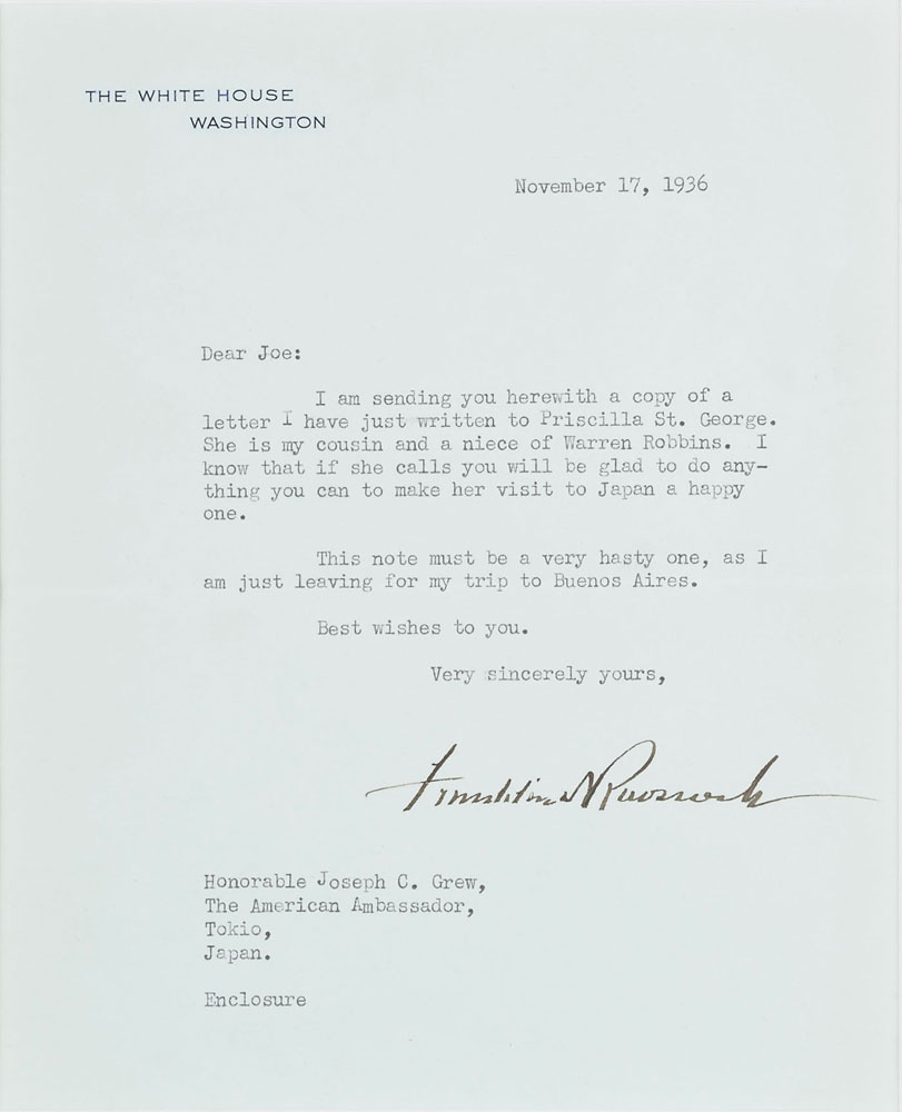 TLS as president, one page, 6.5 x 8, White House letterhead, November 17, 1936. Letter to the Hon. Joseph C. Grew, American ambassador to Japan, in part: "I am sending you herewith a copy of a letter I have just written to Priscilla St. George. She is a cousin and a niece of Warren Robbins. I know that if she calls you will be glad to do anything you can to make her visit to Japan a happy one." Nicely double-matted and framed with a portrait, coin, and nameplate to an overall size of 17.5 x 14.5. In fine condition, with the coin detached from the display's backing. A particularly noteworthy piece of correspondence, as Grew was the American ambassador in Tokyo at the time of the Japanese attack on Pearl Harbor.