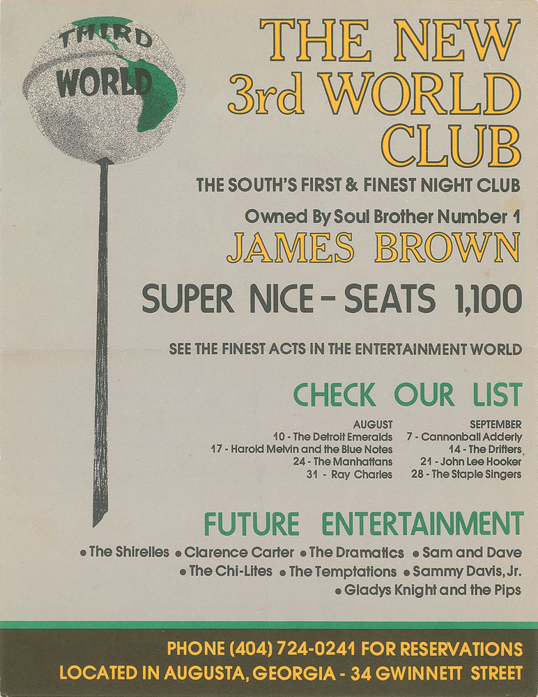 Original color 8.5 x 11 advertising flyer for James Brown's short-lived "3rd World Club" in Augusta, Georgia, from 1973, listing artists scheduled to appear, including: Ray Charles, The Drifters, John Lee Hooker, Cannonball Adderley, The Staple Singers, Sammy Davis Jr., Gladys Knight & The Pips, and The Temptations. In fine condition, with light intersecting folds. After losing money throughout several months of operation, the ambitious night club mysteriously burned to the ground.